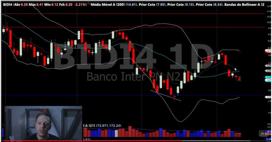 Na manhã desta terça-feira (12), as ações do Banco Inter (BIDI4), marcaram uma queda de 2,59% às 11h20 (no horário de Brasília) a R$ 6,02. O analista técnico da L&S, Fabrício Lorenz, afirmou que no gráfico semanal há uma perspectiva baixista.