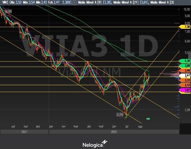 O analista técnico afirmou que os próximos alvos curtos de VIIA3 no canal de alta estão entre R$ 3,69 e R$ 4,34. Nesse sentido, Stagliano disse que para quem deseja comprar o ativo, “esse momento pode ser interessante, se conseguir comprar perto da região dos R$ 3 é melhor ainda”.