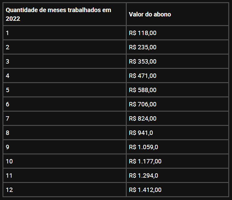 O valor do abono salarial do PIS/PASEP 2024 é proporcional aos meses trabalhados no ano-base. Isto é, o cálculo é feito com base no período em que o trabalhador esteve de fato empregado em 2022, conforme demonstrado na tabela abaixo: