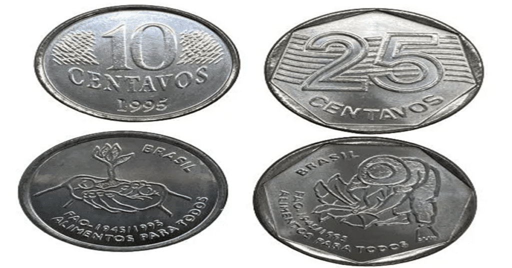As moedas FAO de 10 e 25 centavos de 1995 foram emitidas pelo Banco Central do Brasil. Foram cunhadas em aço inoxidável e possuem um diâmetro de 18 mm. Sua estampa é marcada por diversos elementos representando a cultura e história do país, entre eles, mãos segurando um broto de planta, uma clara alusão à FAO (Organização das Nações Unidas para Alimentação e Agricultura) no aniversário de seus 50 anos.