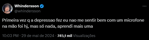 Em uma publicação emocionante, Whindersson revelou que sentiu, pela primeira vez, um desconforto ao performar. “Primeira vez que a depressão fez eu não me sentir bem com um microfone na mão”, declarou ele em sua conta no X, anteriormente conhecido como Twitter. A sinceridade e abertura do humorista em compartilhar suas lutas tocou muitos de seus seguidores, que não hesitaram em oferecer palavras de conforto e encorajamento.