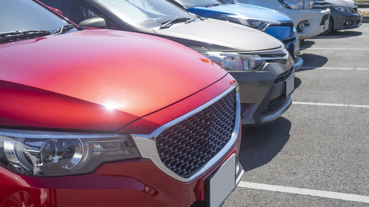Car parking in asphalt parking lot in a row, front of cars close up, automobile transportation dealer business concept
