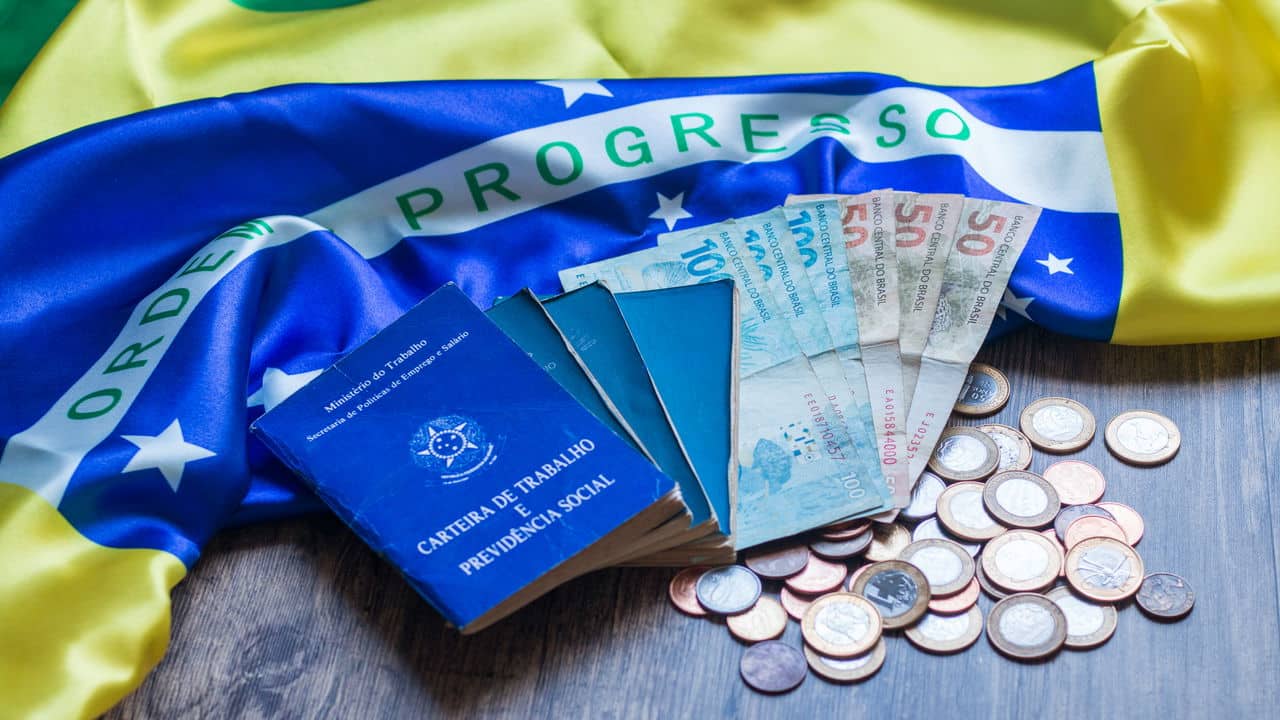 Bandeira do brasil com dinheiro brasileiro e CTPS - Créditos: depositphotos.com / gustavomello162.hotmail.com