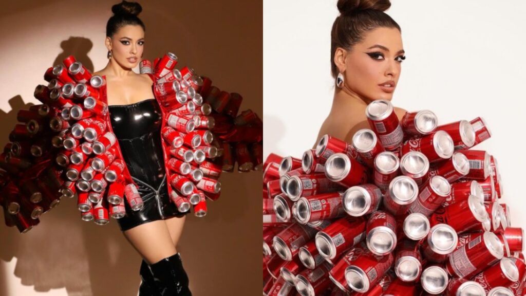 Beatriz Reis com a jaqueta feita de latas – Reprodução / Instagram / @beatrizreisbrasil e @photzmuller
