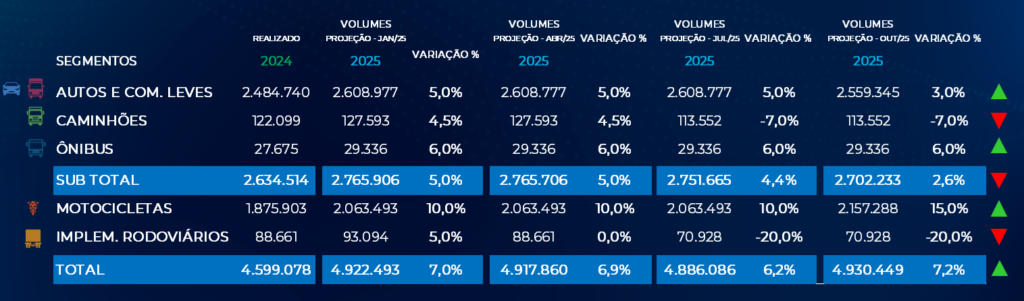 Enquanto o segmento de automóveis e comerciais leves deve encerrar 2025 com alta de apenas 3%, as motocicletas continuam sendo o destaque positivo, com previsão de crescimento de 15% no ano. Esse desempenho ajuda a sustentar o resultado consolidado da indústria, que deve avançar 7,2% — número revisado para cima em relação à projeção de julho (6,2%).