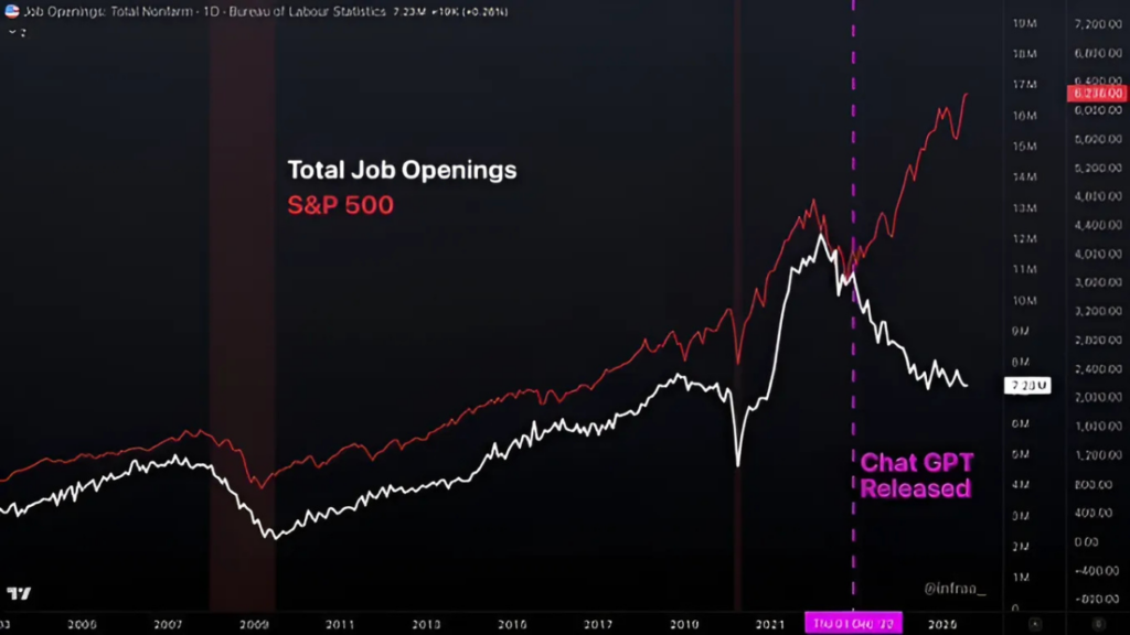 A ascensão da inteligência artificial (IA) não é mais apenas uma inovação de nicho, mas um fenômeno global que já impacta diretamente o mercado de trabalho. O especialista em análise macro Fabio Fares, em entrevistas à BM&C News, destacou que 71% das empresas americanas já incorporaram algum nível de IA em seus processos. Essa transformação gerou o que ele chama de “boca de jacaré”: um gráfico que mostra, de forma visual, a divergência entre a adoção acelerada da tecnologia e a queda das oportunidades de emprego.