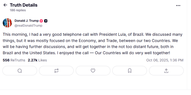 Trump classificou a conversa como “ótima” e disse ter gostado do contato com o brasileiro. “Gostei da conversa — nossos países se darão muito bem juntos!”, afirmou. O presidente norte-americano também sinalizou novos encontros. “Teremos novas discussões e nos encontraremos em um futuro não muito distante, tanto no Brasil quanto nos Estados Unidos.”