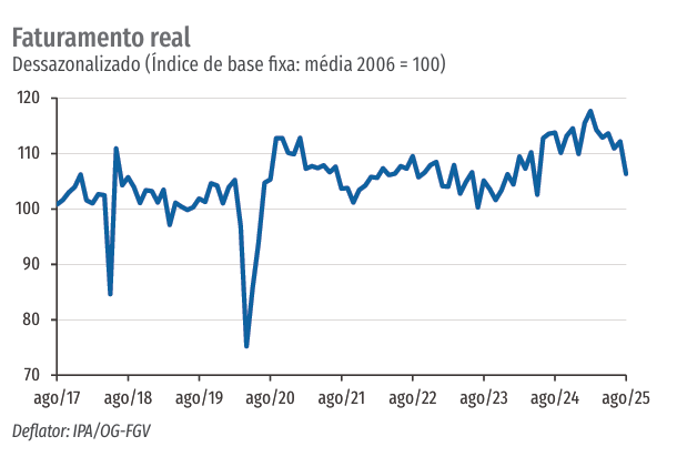 O faturamento real da indústria caiu 5,3% entre julho e agosto, já descontados os efeitos sazonais, registrando a quarta retração nos últimos seis meses. Na comparação anual, a queda é de 7,6% frente a agosto de 2024. Com o resultado, o avanço acumulado de 2025, que até julho era de 5,1%, reduziu-se para 2,9%. A CNI destaca que essa sequência de quedas compromete a trajetória de recuperação do setor e evidencia um ambiente de menor confiança entre os empresários.
