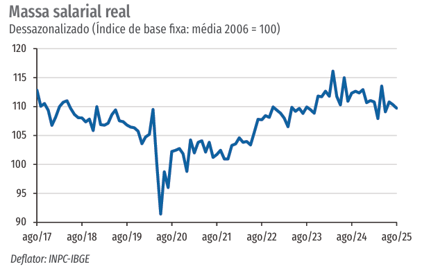 Por outro lado, os indicadores de renda do trabalhador industrial voltaram a cair. A massa salarial real recuou 0,5% entre julho e agosto e acumula queda de 2% no ano. O rendimento médio real também teve retração de 0,6% no mês e de 4,1% no acumulado de 2025 frente a 2024. Essa perda de poder de compra limita o consumo das famílias e, em última instância, retroalimenta a desaceleração do mercado interno.