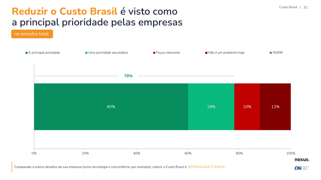 Outro ponto levantado pela pesquisa é a influência do chamado Custo Brasil sobre a competitividade da economia. O termo se refere ao conjunto de fatores estruturais, burocráticos e logísticos que encarecem a produção e limitam o crescimento do país. De acordo com a CNI, o Custo Brasil gera desperdício de aproximadamente R$ 1,7 trilhão por ano, o equivalente a 20% do Produto Interno Bruto (PIB).