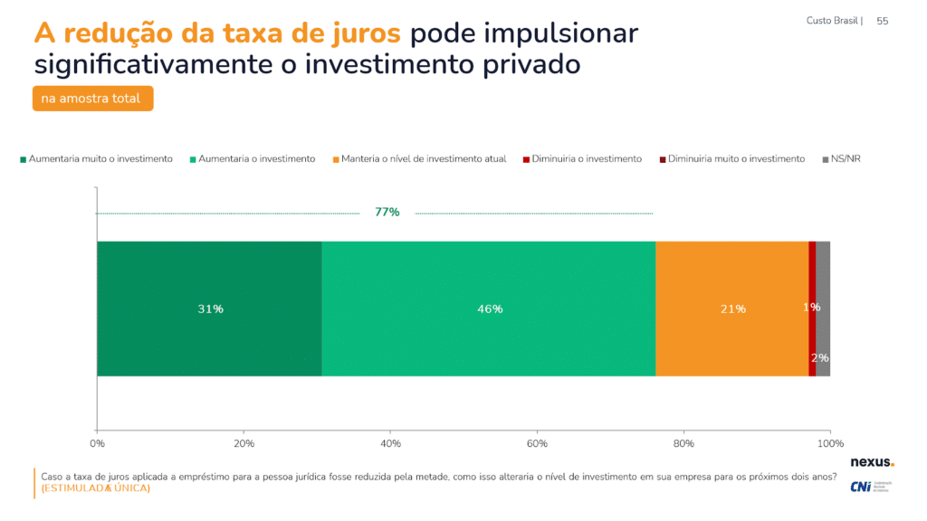 Uma pesquisa encomendada pela Confederação Nacional da Indústria (CNI) à Nexus – Pesquisa e Inteligência de Dados, mostrou que a redução da taxa básica de juros teria efeito imediato sobre o investimento produtivo no Brasil. O levantamento revelou que 77% das empresas industriais aumentariam seus investimentos nos próximos dois anos se a Selic caísse de forma mais expressiva. O dado é uniforme entre pequenas, médias e grandes companhias, indicando que o efeito positivo se estenderia por todo o setor industrial.
