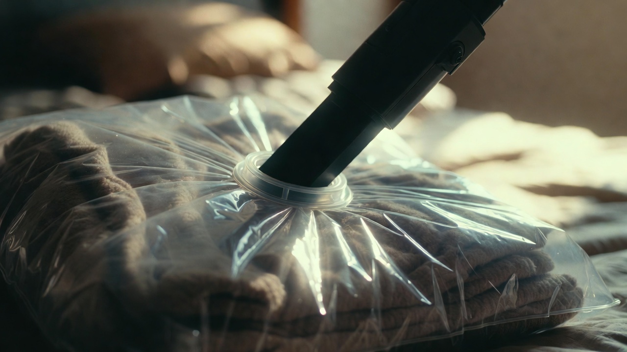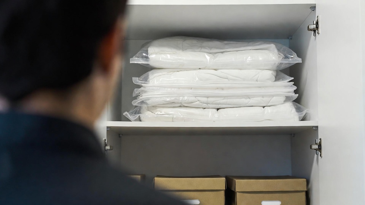 Os sacos organizadores a vácuo transformam enormes montanhas de tecido grosso em pacotes extremamente finos de forma muito rápida. Esse método prático protege suas peças contra fungos nocivos e devolve o espaço perdido no seu armário.