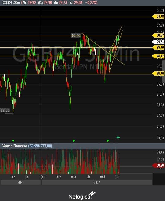 O analista explicou que as ações de GGBR4 vinham trabalhando numa tendência de baixa, iniciada no final de março e no final de maio, conseguiu reverter a tendência.