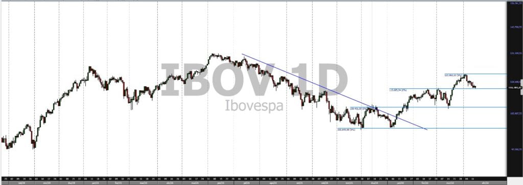 O professor recordou que o IBOV sofreu um longo período de queda até dezembro do ano passado, em seguida, o mercado encontrou fundo na região dos 100.650 pontos. “Tentou subir, parou de subir nos 108.400 pontos desceu de novo, deixando um fundo duplo”.
