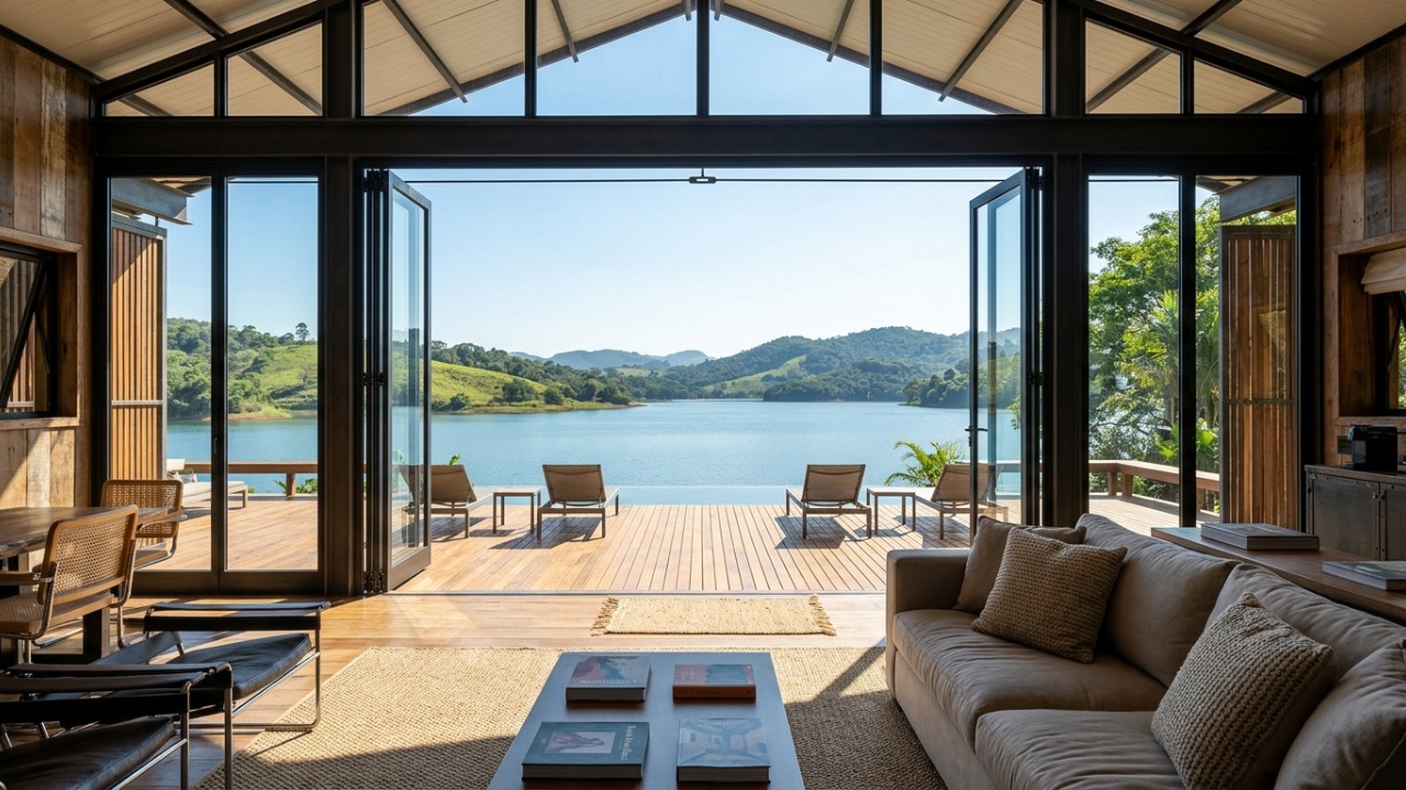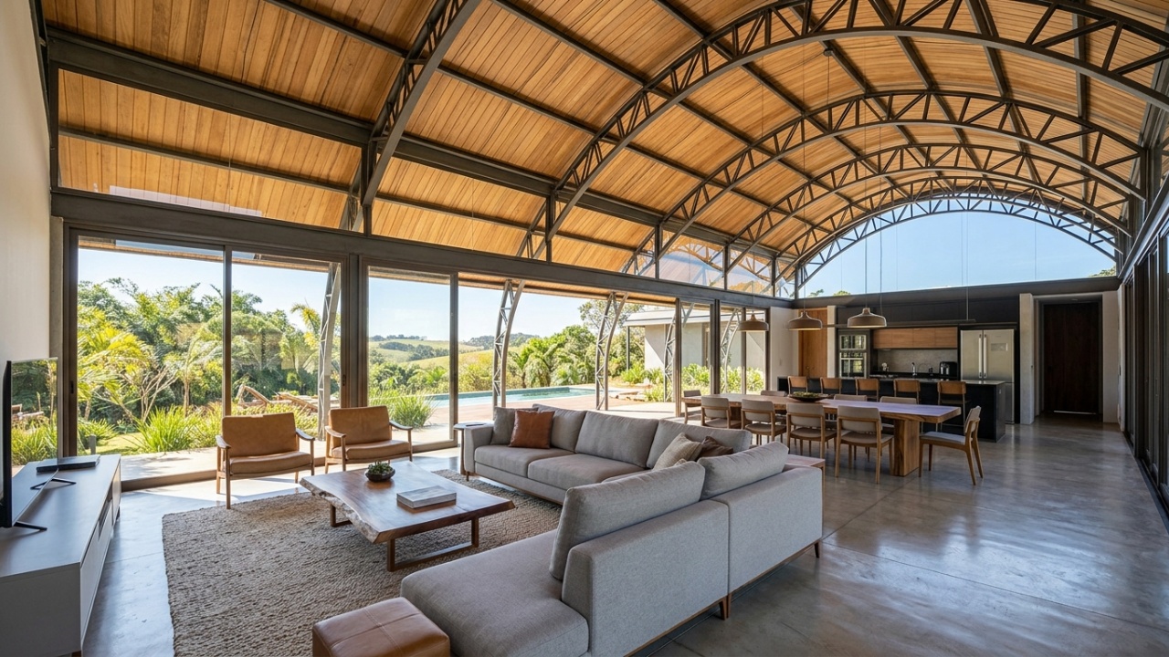 Nem todo projeto começa com uma planta em branco. Essa casa curva começou com a paixão da própria arquiteta por galpões industriais e paraquedismo, e terminou como uma residência de 210 m² no interior de São Paulo com teto de 5,5 metros no ponto mais alto, vista para a represa e um lavabo que parou todo mundo durante o tour.