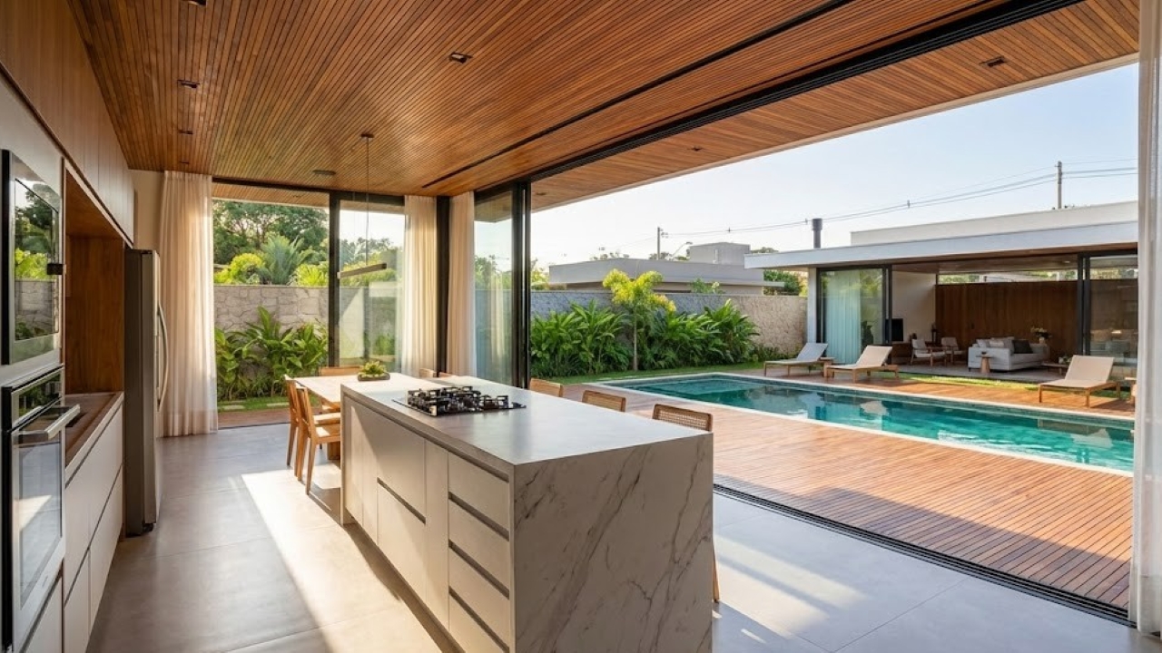 Para ilustrar como essa organização espacial funciona no dia a dia, selecionamos o conteúdo do canal Tropic, que conta com 395 mil inscritos. No vídeo a seguir, você pode conferir o tour completo por esta residência prática e elegante, observando como o deck conecta a sala diretamente à piscina: