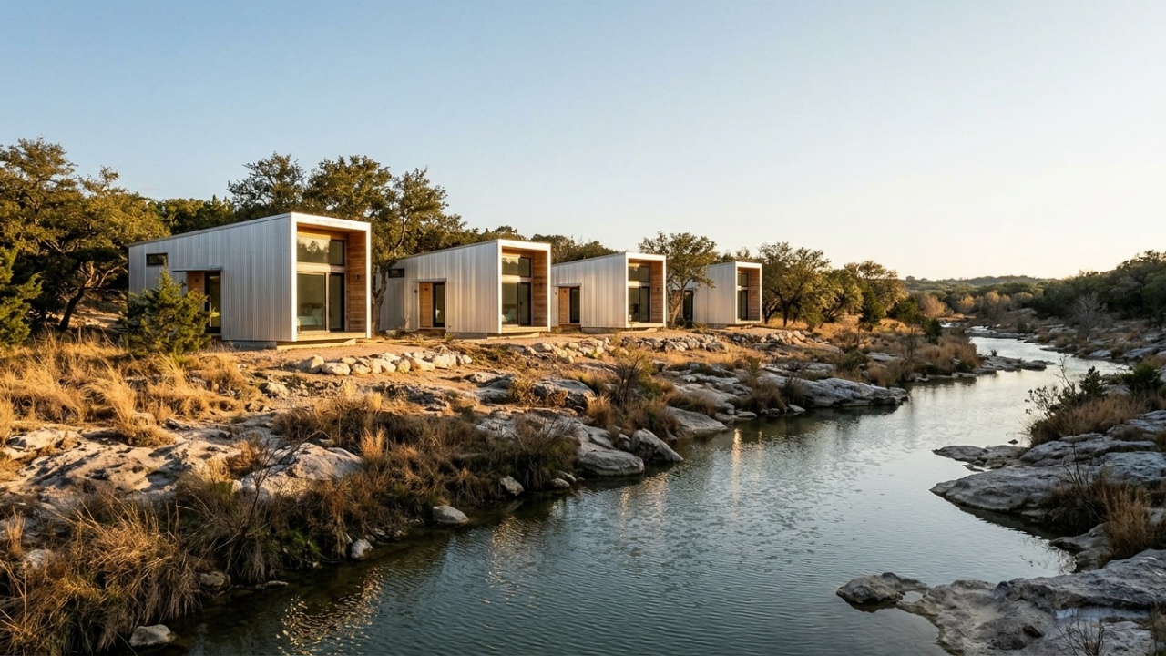 A “Bestie Row” é composta por quatro casas de aproximadamente 32 a 37 metros quadrados cada, pequenas mas funcionais, com quarto, banheiro, cozinha e área de estar. As residências foram projetadas para aproveitar ao máximo a vista do rio e integrar o interior ao ambiente natural do Hill Country texano.
