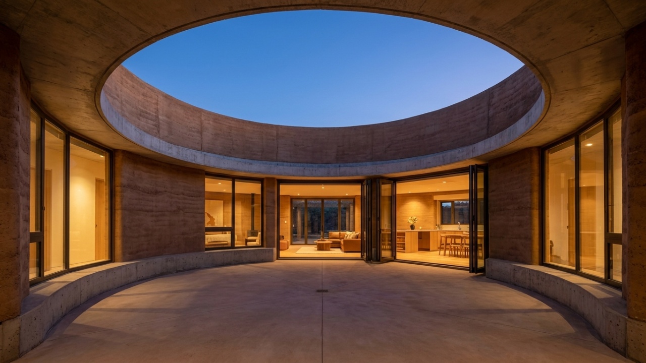 Segundo o ArchDaily, a estrutura foi concebida como um relógio solar vivo: ao longo do dia, os volumes se abrem para o paisagismo externo, enquadrando o Monte Xinantécatl em ângulos que mudam conforme o sol avança. À noite, a vida se volta para dentro e o pátio circular se torna o centro gravitacional da casa.