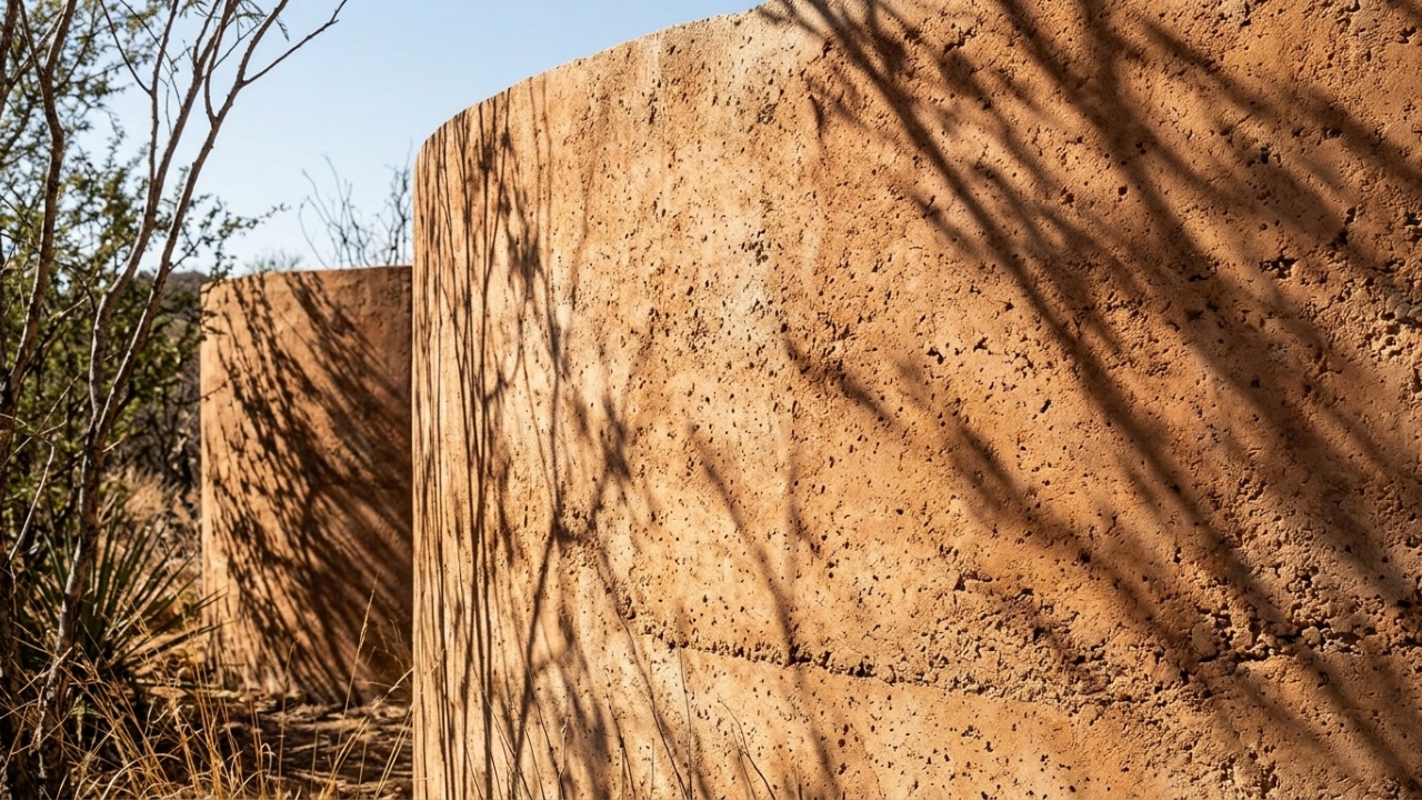 Para que a casa circular se mimetizasse ao entorno, Fernanda Canales escolheu construir com terra local misturada a concreto, um composto que resulta num acabamento terroso como se sempre tivesse estado ali. Além da aparência, o material cria uma massa térmica natural que absorve o calor durante o dia e o libera à noite, essencial num ambiente onde a temperatura pode variar 30 °C em um único dia.