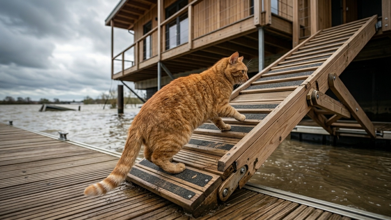 Um dos desafios menos óbvios das casas anfíbias é a rotina dos animais domésticos durante as fases de flutuação. As docas bem projetadas incluem passarelas articuladas e rampas de acesso que acompanham o movimento vertical da estrutura, garantindo que cães e moradores possam entrar e sair mesmo quando a casa está metros acima do nível do solo.