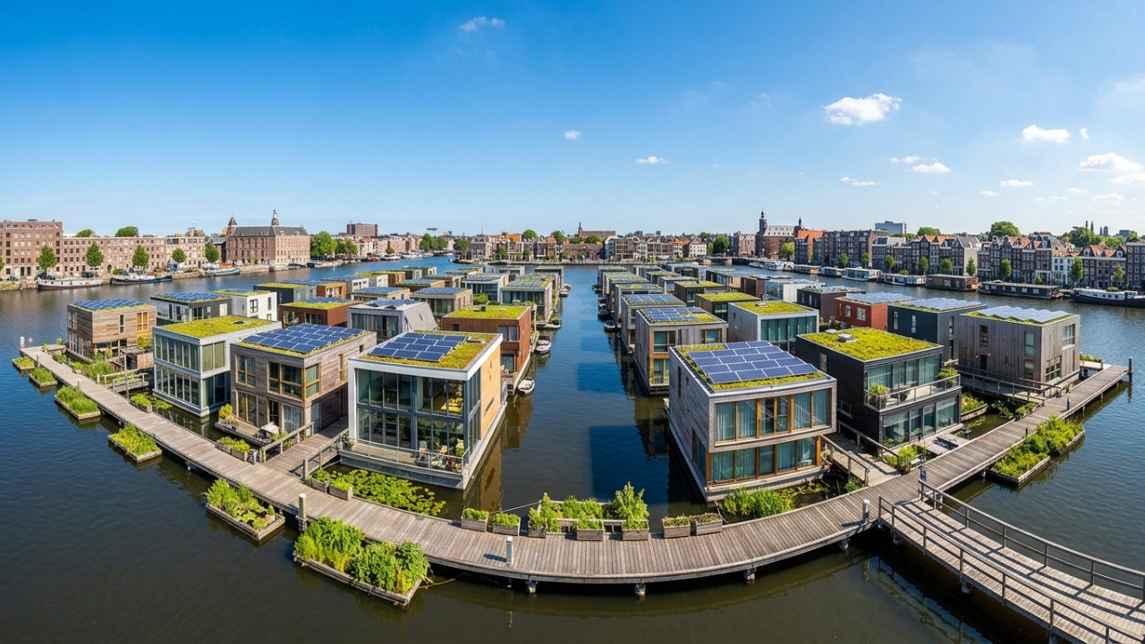 Em Amsterdã, o bairro flutuante Schoonschip, concluído em 2021, reúne 46 casas em 30 lotes aquáticos com sistemas descentralizados de energia solar, gestão de água e resíduos, abrigando mais de 100 moradores permanentes. “Nós nos sentimos mais seguros durante a tempestade porque flutuamos”, relatou a moradora Siti Boelen em entrevista à BBC em dezembro de 2025.