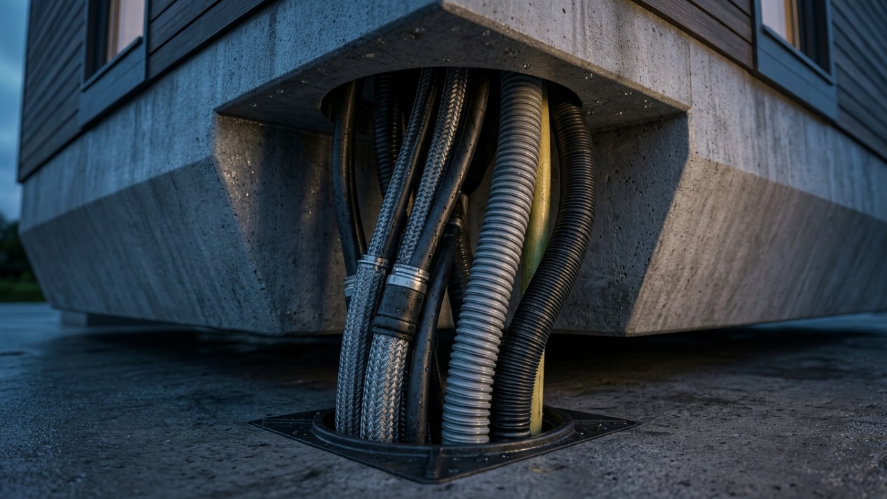 Todas as conexões de serviço, como eletricidade, água, esgoto e gás, são feitas com tubulações flexíveis