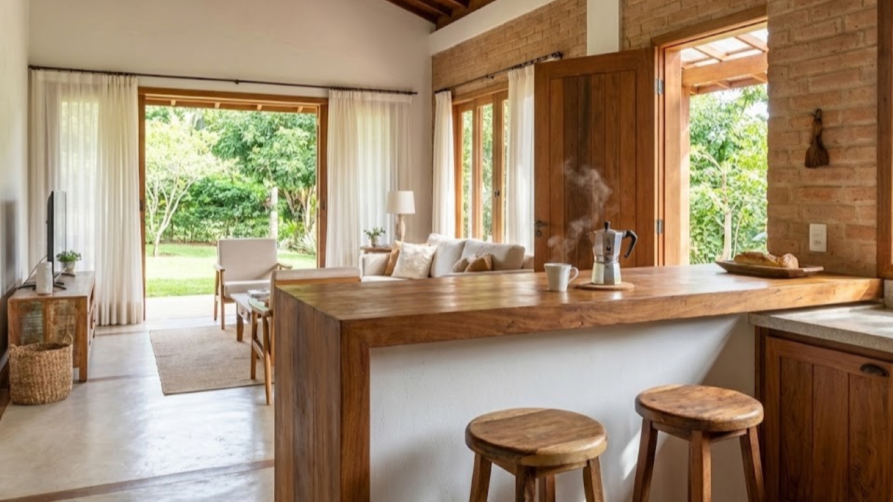 A planta foi desenhada para promover a convivência familiar. A sala de estar se integra totalmente à cozinha por meio de um balcão rústico, criando um ambiente único e arejado. A circulação de ar cruzada mantém o frescor mesmo nos dias mais quentes.