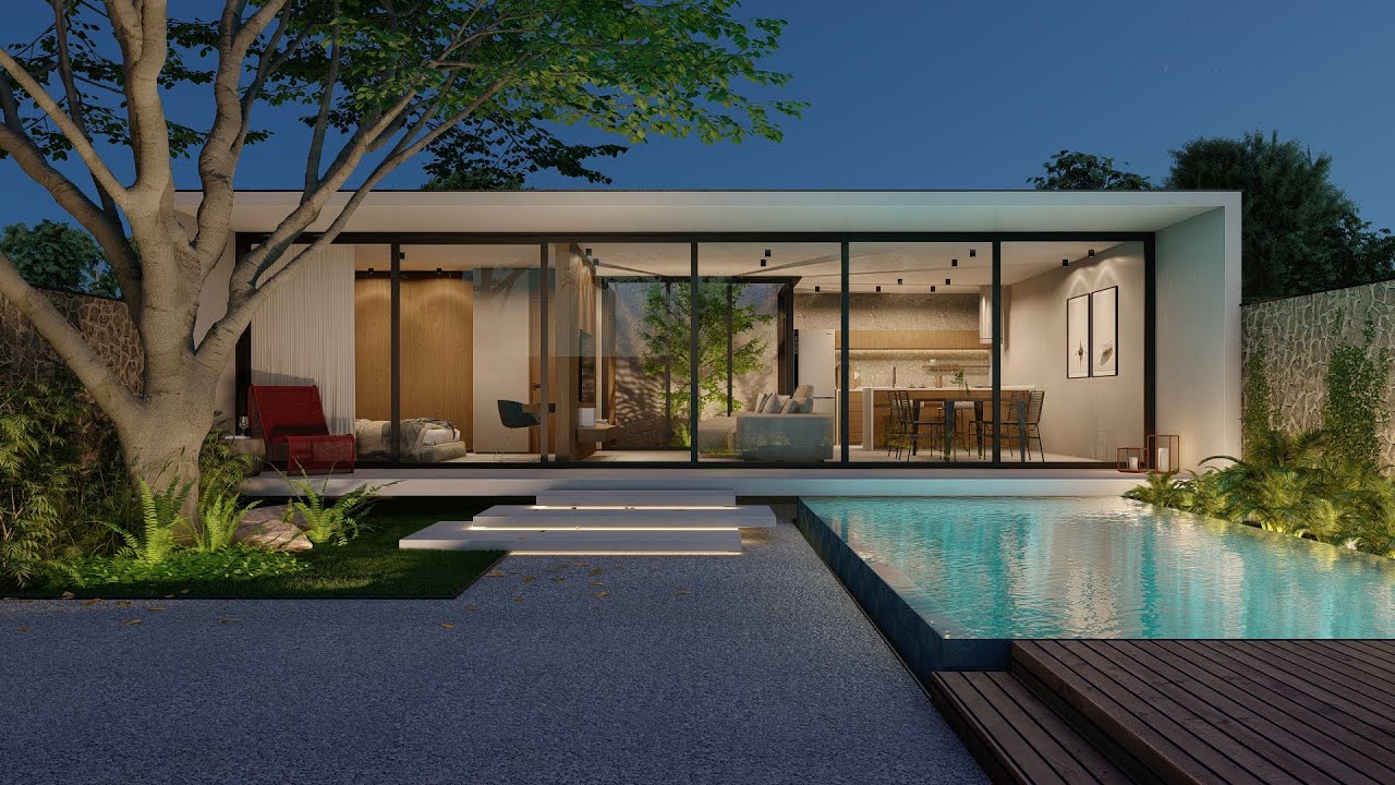 Para vencer a limitação da metragem, a planta aposta na eliminação de paredes desnecessárias. A área social integra sala de estar, sala de jantar e uma cozinha com ilha em um único ambiente contínuo. Essa fluidez, somada às grandes esquadrias de vidro, conecta o interior ao deck da piscina, promovendo uma sensação de liberdade espacial.