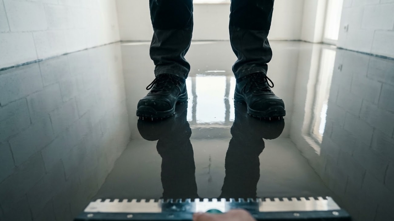 Com cimento autonivelante e um rolo fura-bolha, este piso de concreto irregular virou uma superfície lisa igual a porcelanato líquido