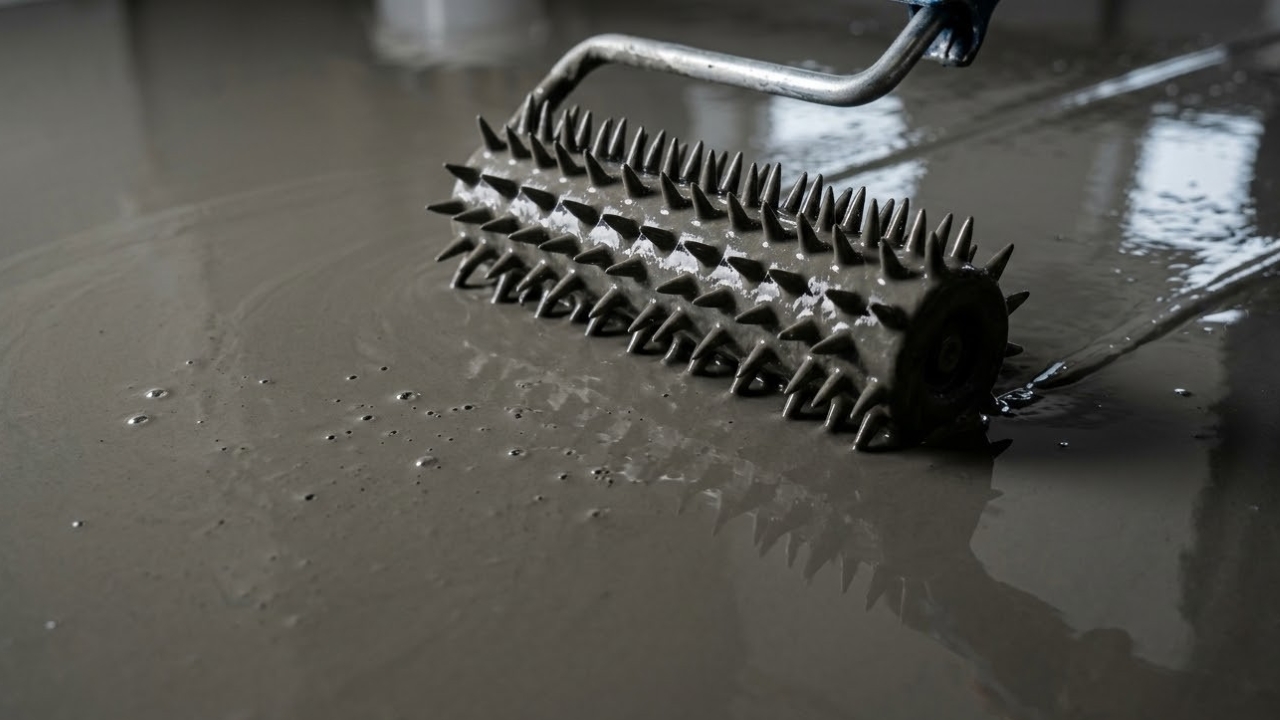 É aí que entra o rolo fura-bolha. Passar essa ferramenta espinhosa repetidas vezes sobre o material ainda úmido não apenas estoura o ar, mas ajuda a revelar o brilho espelhado da massa. É nesse exato momento que o chão feio se transforma em um espelho contínuo que lembra o cobiçado porcelanato líquido.