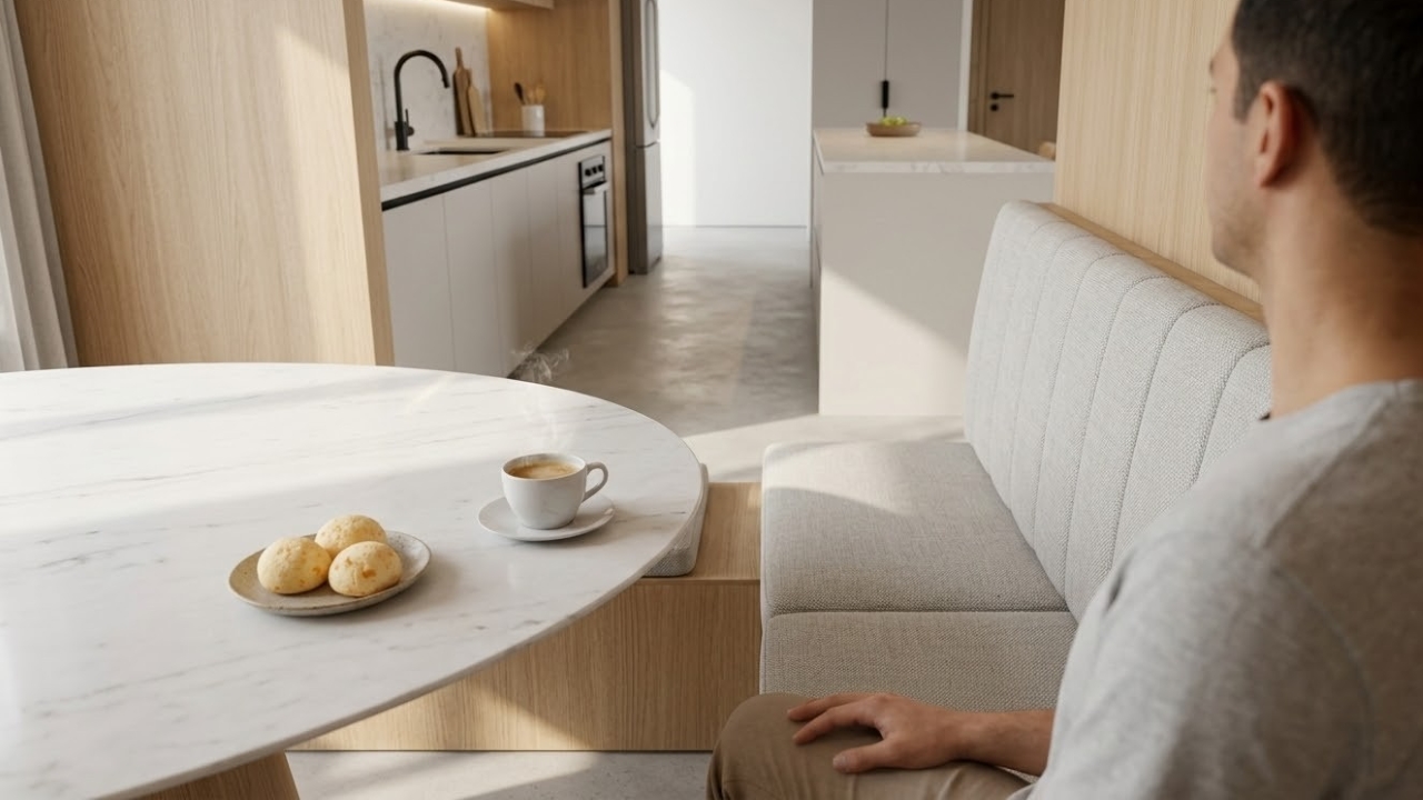 Ao adotar essa nova estrutura fixa junto à parede ou na lateral da ilha, você libera o centro do ambiente e reduz drasticamente a poluição visual. O design contínuo acomoda de 5 a 6 pessoas na mesma metragem que antes abrigava apenas quatro assentos soltos, unindo o cômodo de forma coesa e elegante.