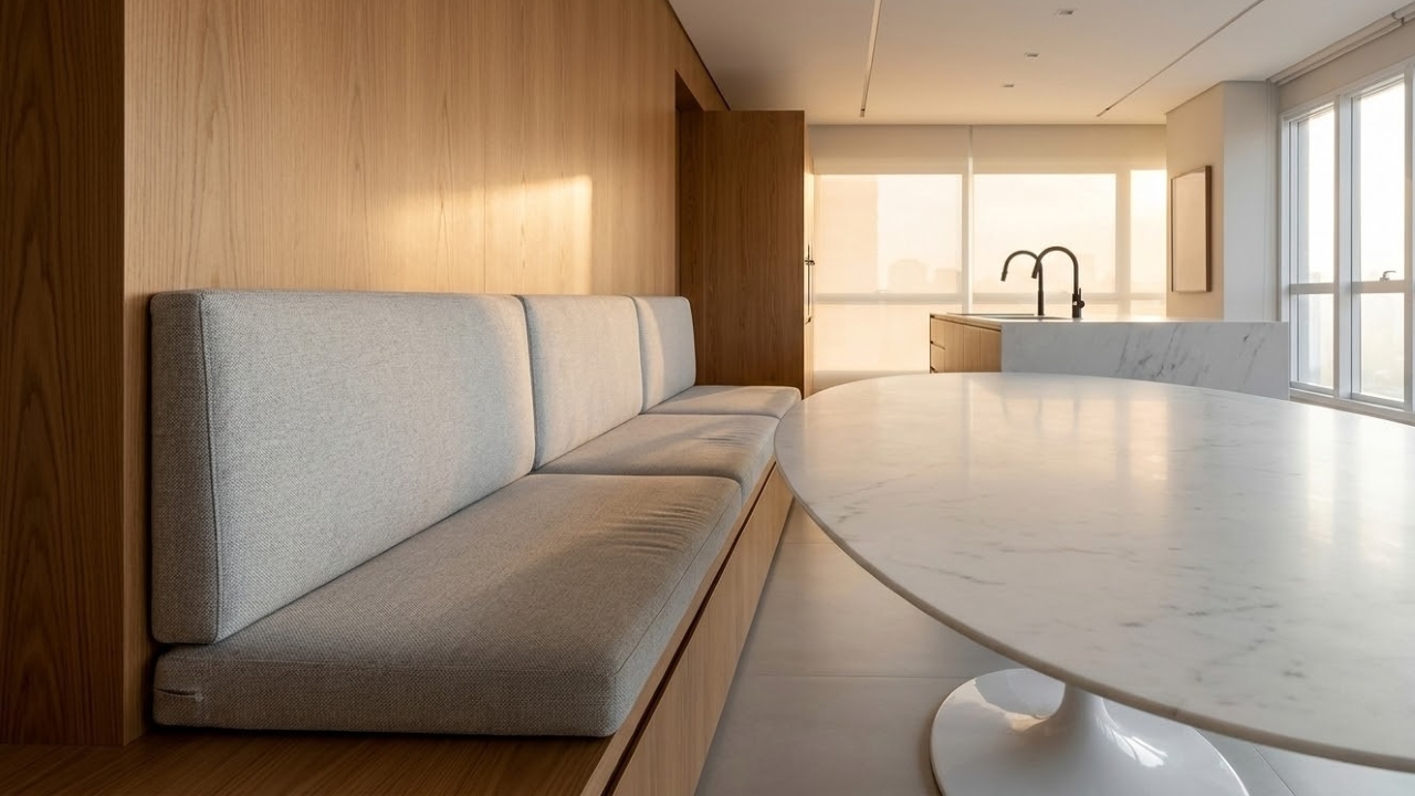 Por que o banco estofado embutido otimiza o espaço das cozinhas?