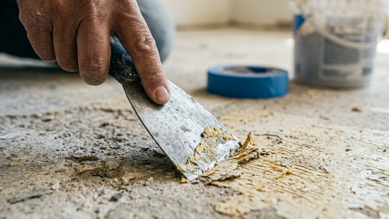 Como a camada final tem apenas 3 milímetros, qualquer excesso de cola, massa ou cimento antigo aparece no resultado. O defeito não some por conta própria, ele precisa ser eliminado antes. A raspagem com espátula é o ponto de partida obrigatório, seguida do preenchimento de buracos maiores com massa de cimento e cola, respeitando pelo menos 72 horas de cura antes de prosseguir.