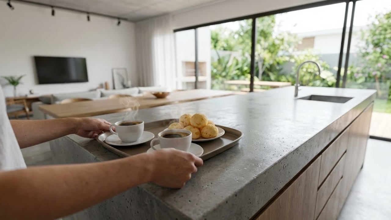 A estética da casa combina concreto aparente com painéis de vidro, criando uma linguagem visual contemporânea e atemporal. O telhado oculto garante linhas retas que remetem ao estilo europeu moderno, enquanto os materiais nobres elevam o valor do imóvel e garantem durabilidade à obra.