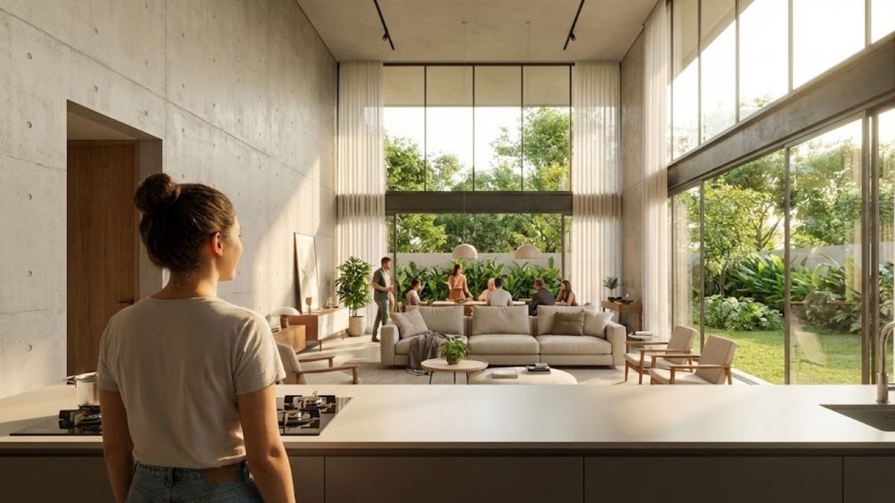 Projetada para famílias jovens que valorizam o convívio, a casa contemporânea de 140 metros quadrados aposta em linhas retas, fachada de vidro e telhado oculto. A integração total entre living e cozinha elimina corredores e amplia a sensação de espaço, criando um refúgio urbano perfeito para quem adora receber amigos e familiares.