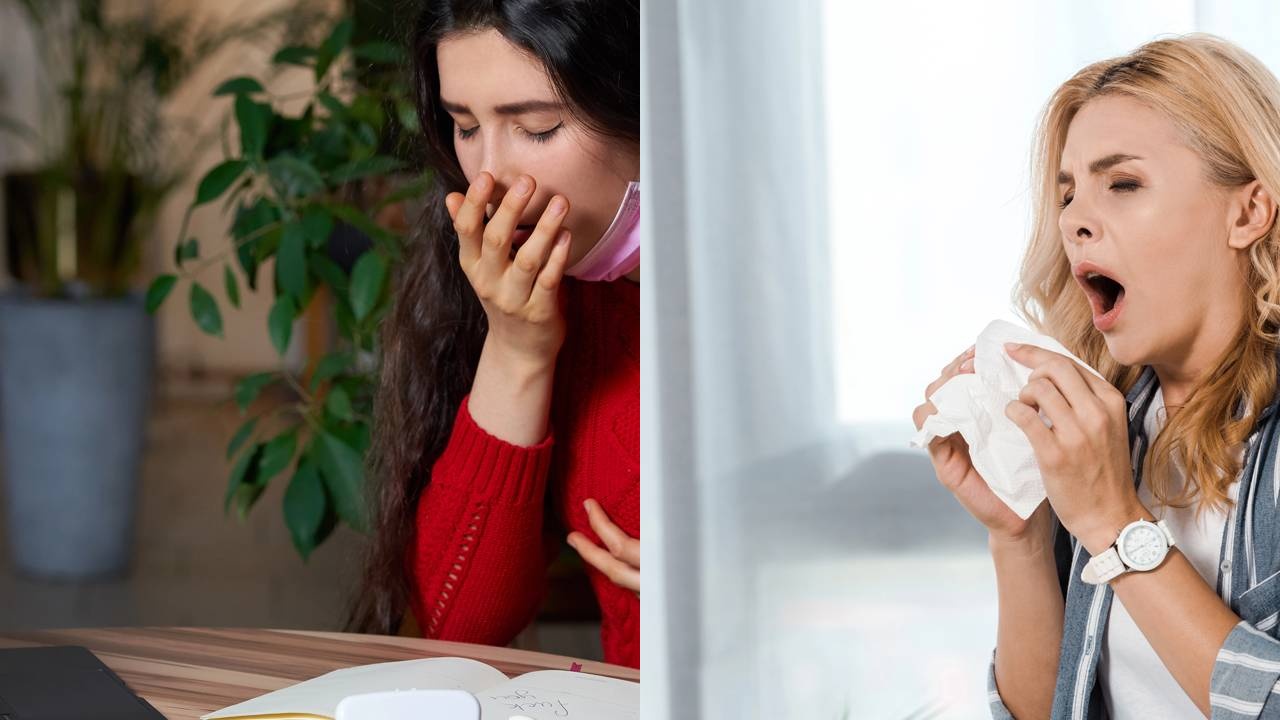 Mulher com os olhos fechados segurando um guardanapo e espirrando em casa e mulher doente tossindo com comprimidos e termômetro em uma mesa trabalhando em um laptop em casa em isolamento de quarentena - Créditos: depositphotos.com / mariakray - Créditos: depositphotos.com / IgorVetushko