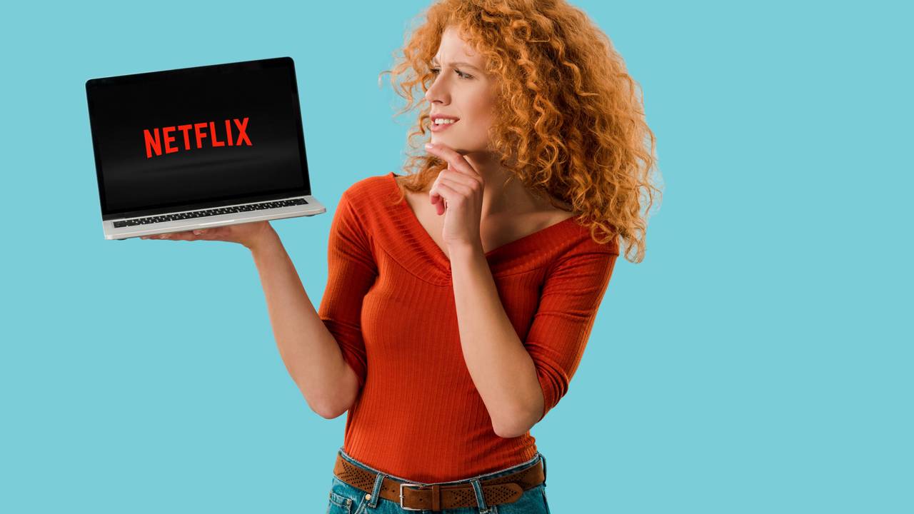 Mulher ruiva pensativa segurando um laptop com o site da Netflix aberto, isolada em fundo azul - Créditos: depositphotos.com / AndrewLozovyi