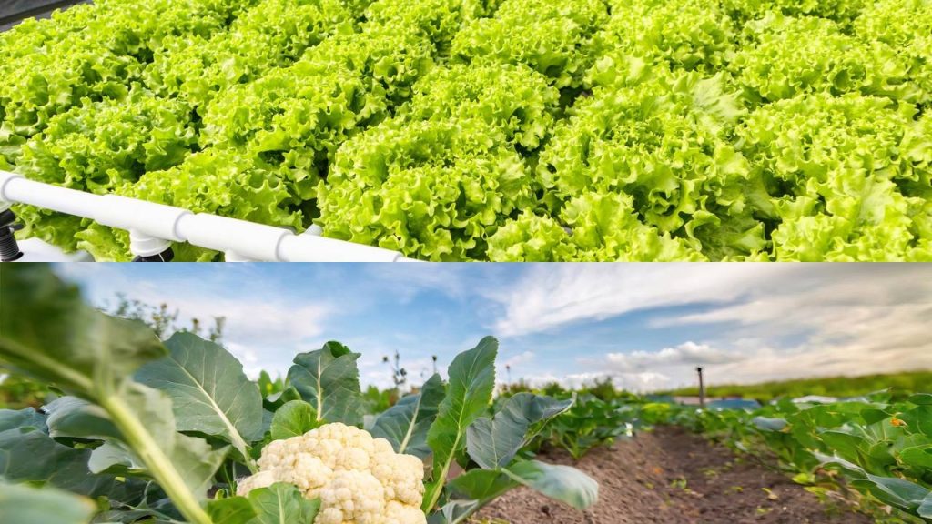 Couve-flor – Brassica oleracea – cabeça branca é composta por um meristema de inflorescência branca comestível com folhas verdes crescendo em solo rico em nutrientes e Alface-verde orgânica fresca em sistema de cultivo hidropônico – Créditos: depositphotos.com / Kwangmoozaa – Créditos: depositphotos.com / spineback