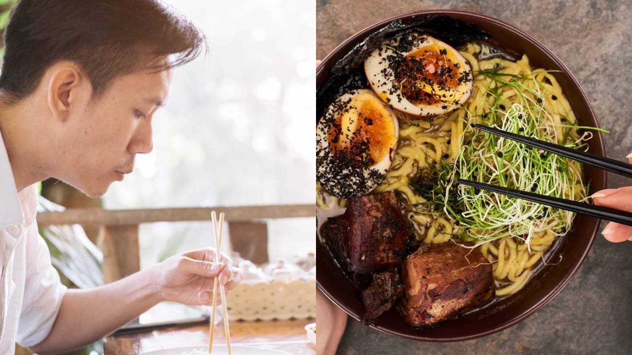 Homem comendo com hashis e tigela de ramen com ovos (Créditos: depositphotos.com / karrastock.gmail.com // Créditos: depositphotos.com / VadimVasenin)