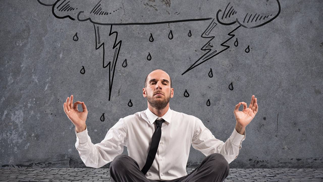 Homem meditando com expressão calma sob desenho de nuvem com raios e chuva (Créditos: depositphotos.com / alphaspirit)