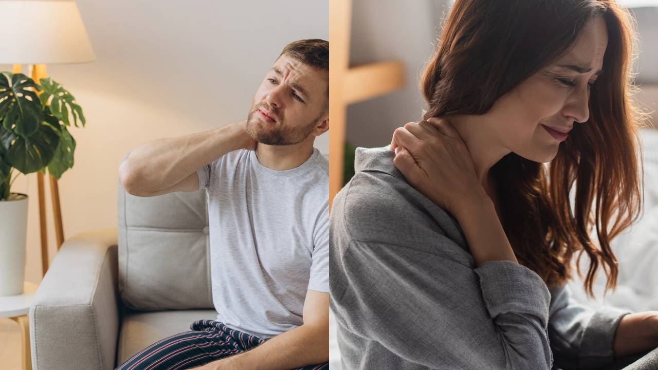 Dor no pescoço. Homem caucasiano massageando o pescoço dolorido no sofá da sala de estar em casa e Mulher morena chateada sofrendo de dor no pescoço no quarto - Créditos: depositphotos.com / HayDmitriy - Créditos: depositphotos.com / anatoliycherkas