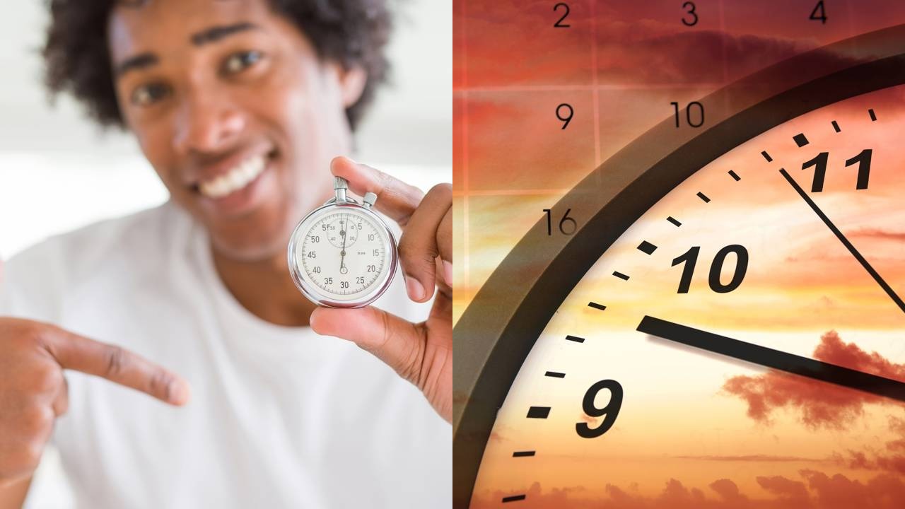 Homem afro-americano segurando um cronômetro, muito feliz, apontando com a mão e o dedo e o tempo passando - Créditos: depositphotos.com / stillfx - Créditos: depositphotos.com / Krakenimages.com