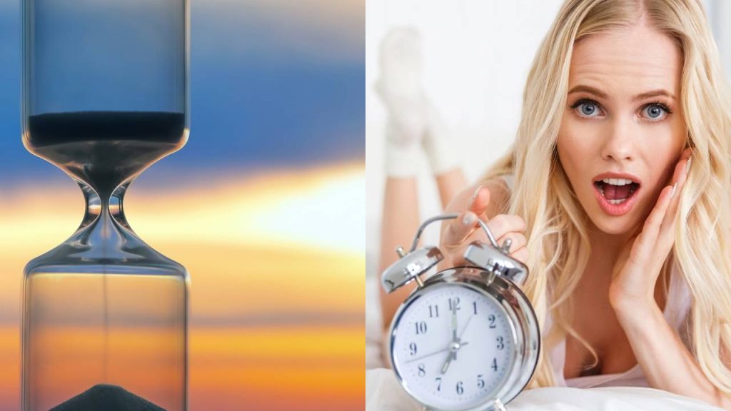 Ampulheta sobre um pôr do sol. O valor do tempo e uma mulher chocada com a passagem do tempo – Créditos: depositphotos.com / VaDrobotBO – Créditos: depositphotos.com / OlegTroino