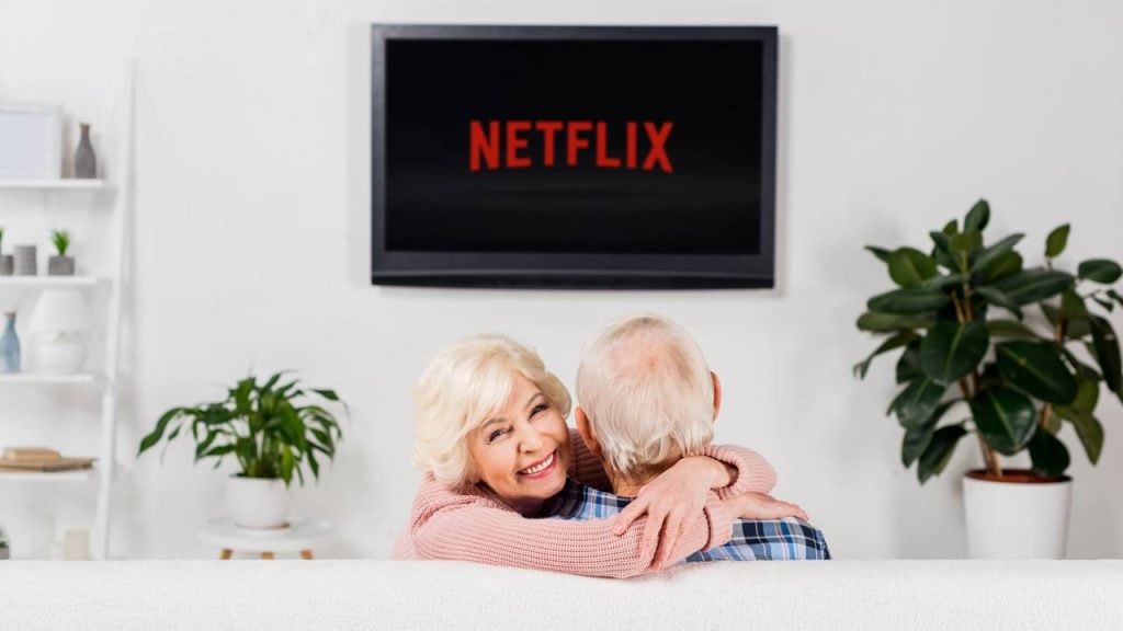 Casal de idosos se abraçando no sofá em frente à TV com o logotipo da Netflix na tela – Créditos: depositphotos.com / IgorVetushko
