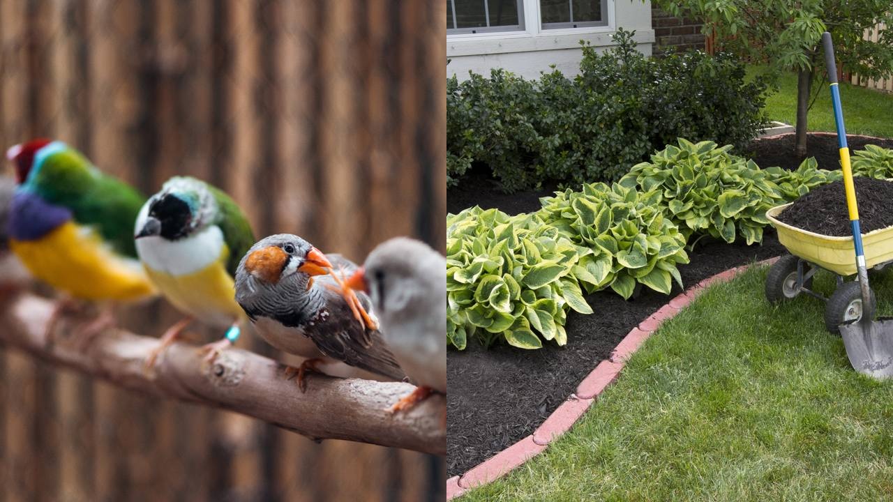 Foco seletivo de pássaros exóticos coloridos em galho de madeira e Cobertura morta ao redor dos arbustos - Créditos: depositphotos.com / oocoskun - Créditos: depositphotos.com / MicEnin
