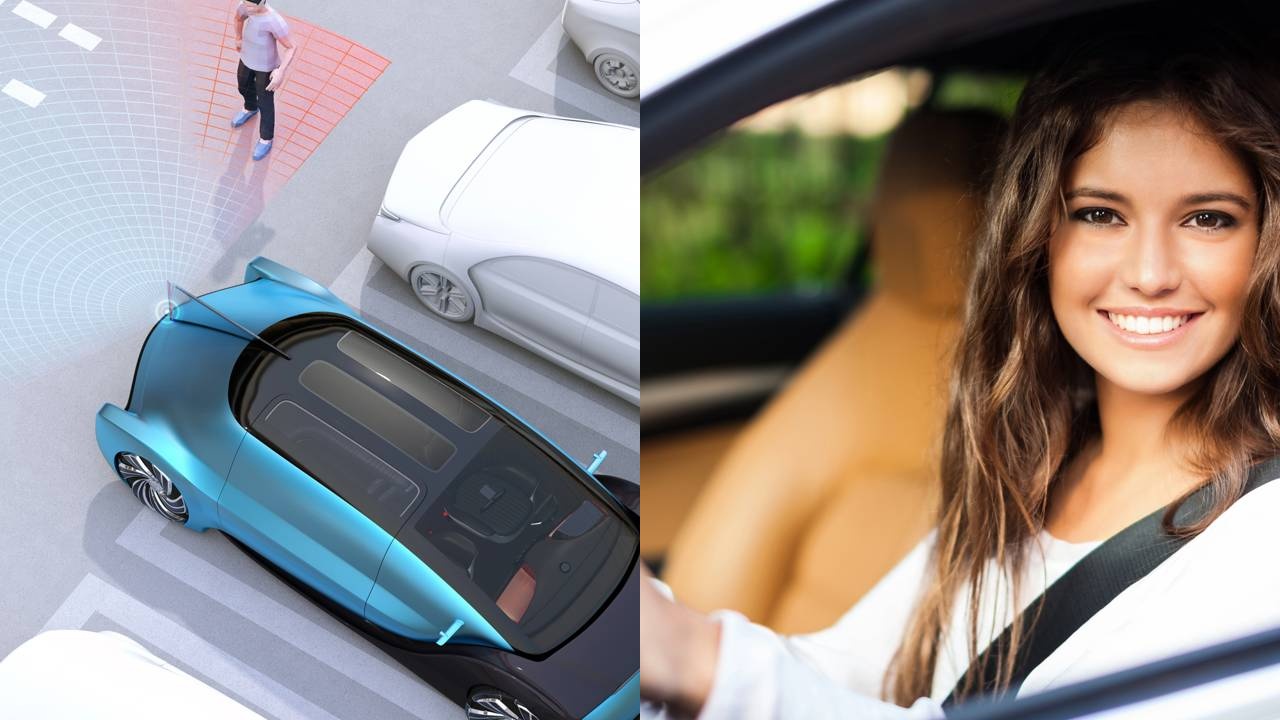 Carro preto estacionado de frente para o veículo parou em emergência quando o sensor traseiro detectou um pedestre próximo. Conceito de sistema avançado de assistência ao motorista. Imagem em renderização 3D e Mulher dirigindo seu carro - Créditos: depositphotos.com / minervastock - Créditos: depositphotos.com / chesky_w