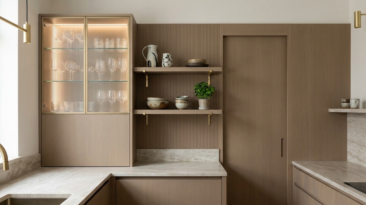 O que as principais referências de design apontam para 2026 não é exatamente a morte do armário, mas uma recomposição dos espaços: armários superiores mais seletivos, combinados com prateleiras abertas em pontos estratégicos, vidros frontais em substituição de portas opacas e iluminação de nicho para valorizar os objetos expostos.