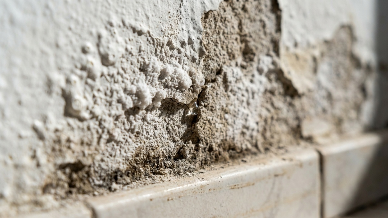 O resultado visível são as manchas que sobem a partir do rodapé, a eflorescência (o sal branco que aparece na superfície), o reboco se esfarelando e a tinta descascando em camadas. Tratar esses sintomas sem resolver a causa é como secar o chão com a torneira aberta.