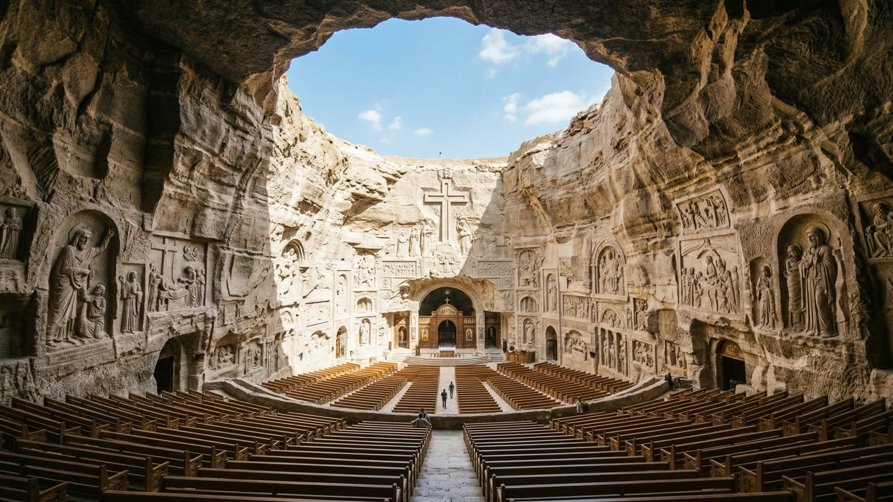 Entre pilhas de plástico e o cheiro constante de resíduos, as colinas de Mokattam escondem a maior igreja do Oriente Médio. O Mosteiro de São Simão, o Curtidor, também chamado de Igreja da Caverna, foi escavado diretamente na rocha a partir de 1975. Sua nave principal, a céu aberto, comporta 20 mil fiéis sentados.