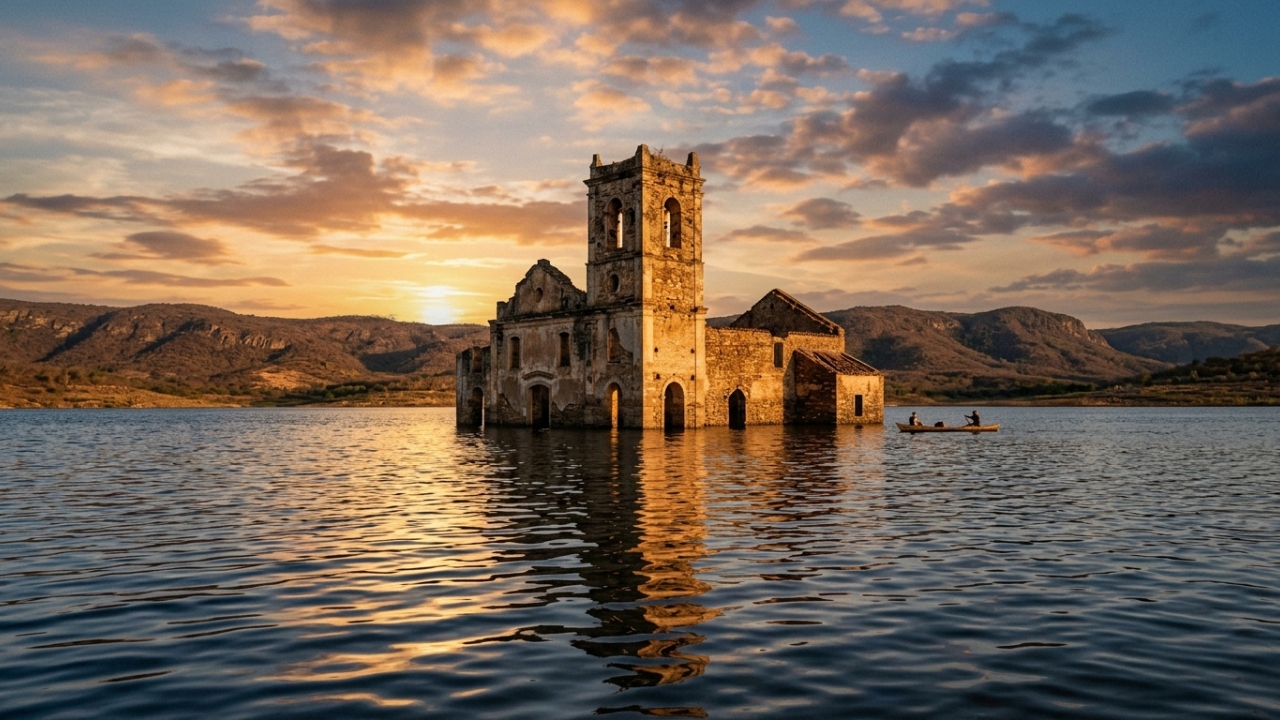 No sertão de Pernambuco, a cerca de 470 km de Recife, uma torre de igreja surge das águas do Rio São Francisco sempre que a seca aperta. É a única ruína visível de Petrolândia, cidade inteira que foi submersa em 1988 para formar o reservatório da Usina Hidrelétrica Luiz Gonzaga. Casas, ruas, praças e igrejas ficaram no fundo, e apenas parte do telhado e da fachada da Igreja do Sagrado Coração de Jesus ainda desafia o tempo no meio do lago.